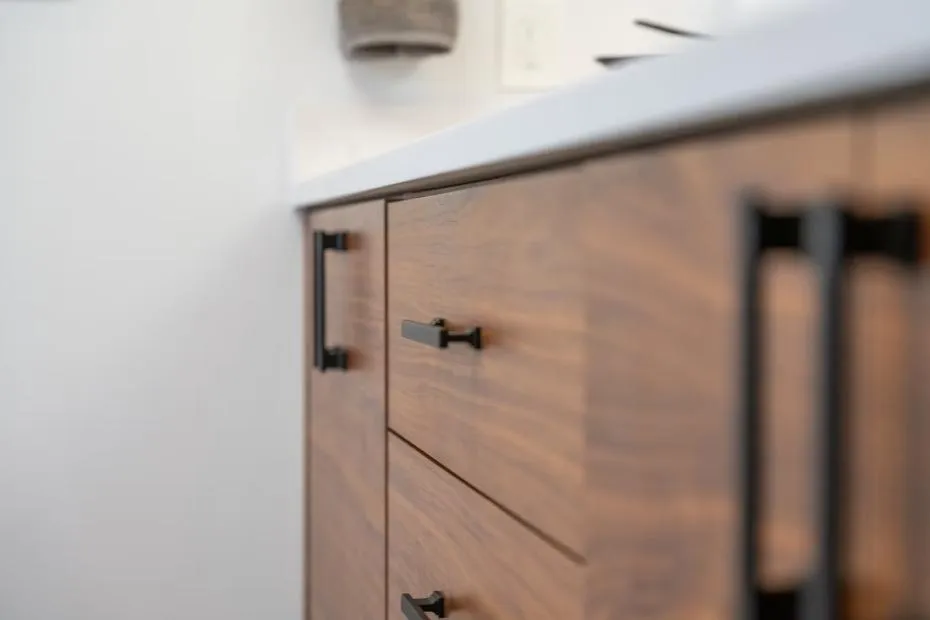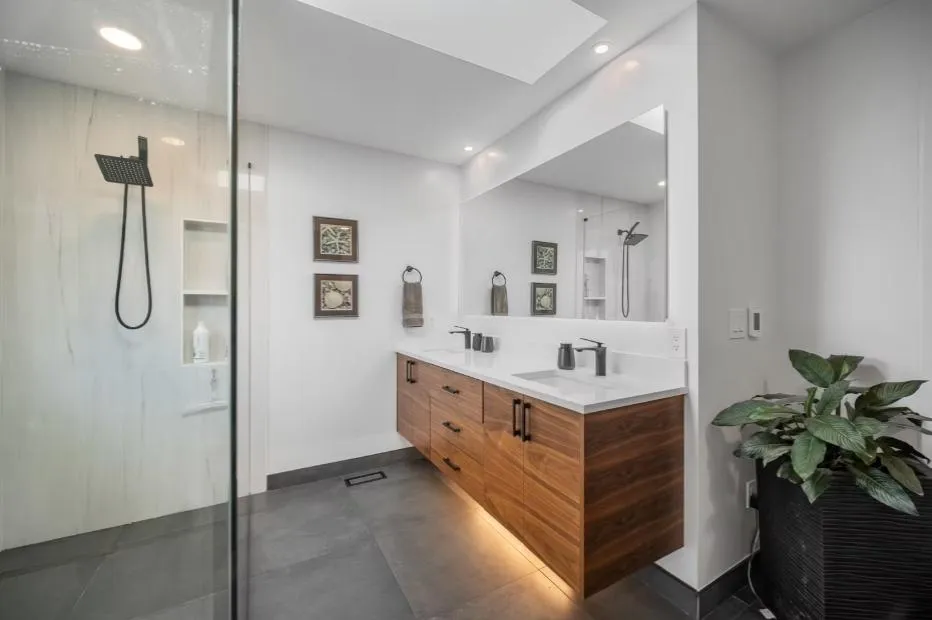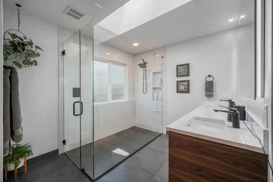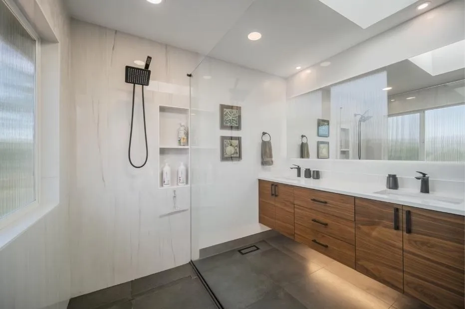 Custom walnut cabinetry was built by our partners at Moda Woodworking, helping us deliver a warm, timeless design. Additional details included a linear drain and sleek Aria vent to maintain a modern, open look.