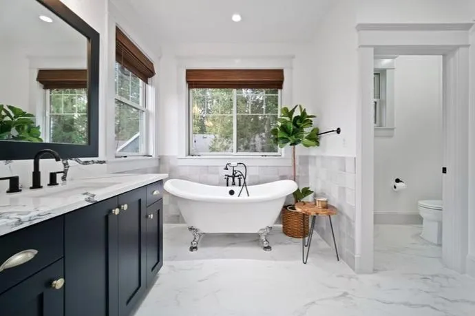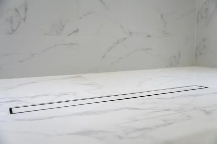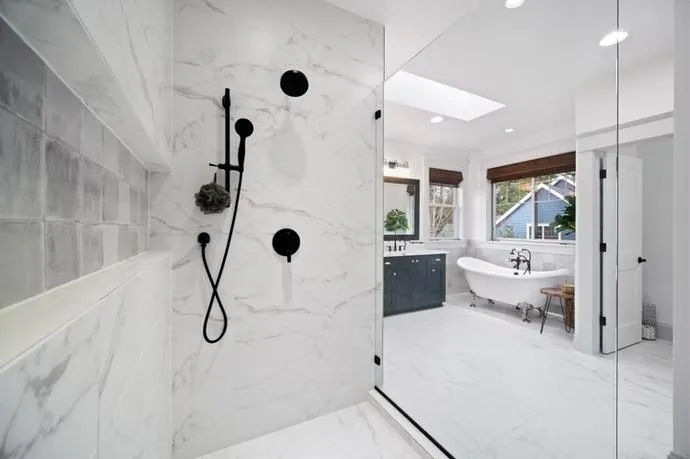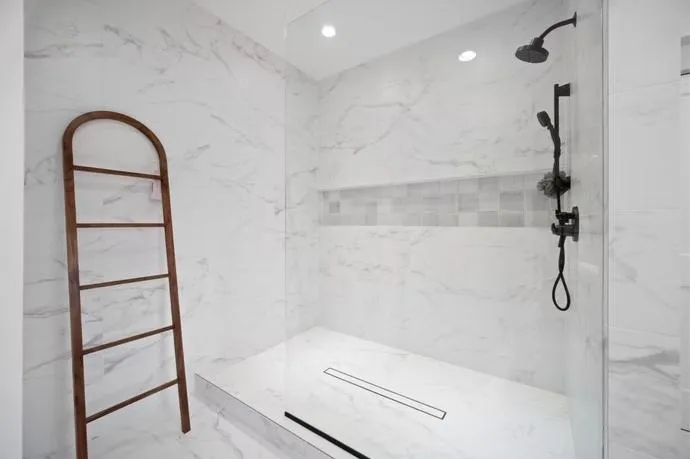 The finished space included white marble-like porcelain tile across the floors, shower pan, and shower walls, giving the bathroom a bright, luxurious feel. We also removed part of the wall enclosing the shower, making it feel larger and more open while keeping the same footprint. To maximize storage, we added a wall-to-wall niche along the back of the shower for a sleek, functional detail.