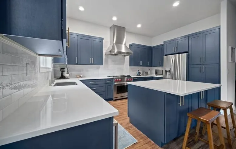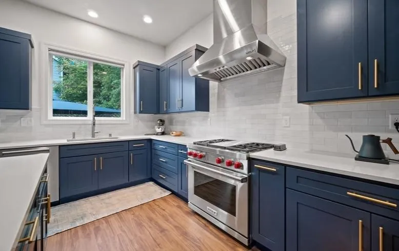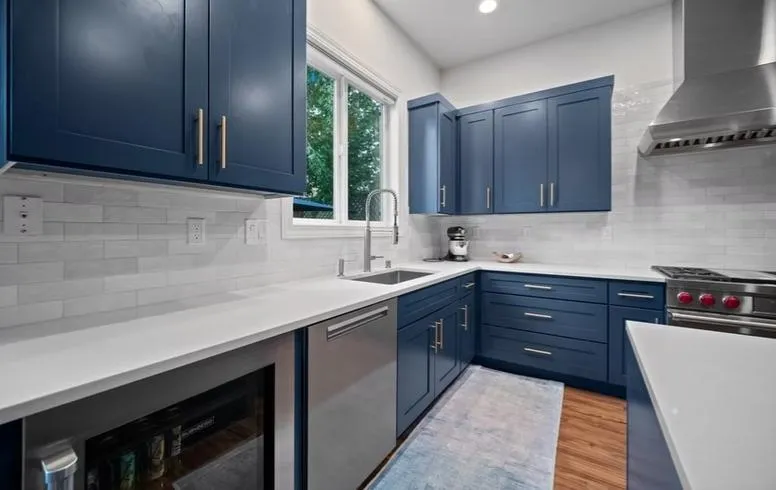 For this project, we upgraded the space with new flooring, custom cabinetry, and top-of-the-line Wolf appliances, creating a kitchen that is both beautiful and highly functional. The navy blue finish brought personality and warmth, making it a space designed to be lived in and enjoyed daily.